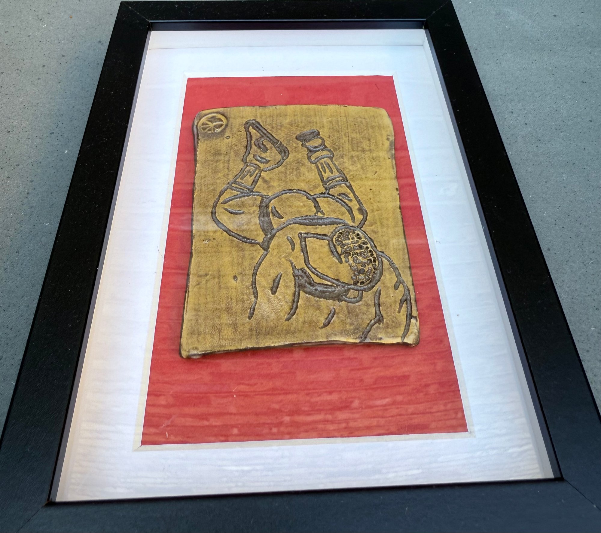Material : Negra with Copper glaze, mounted on hand coloured, hand made paper and black frame.